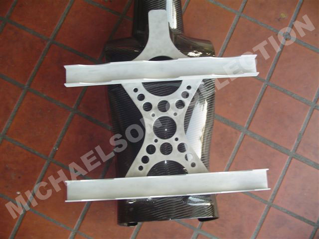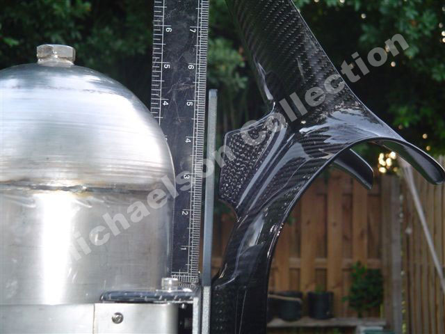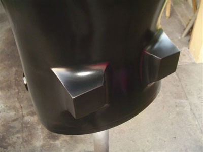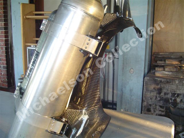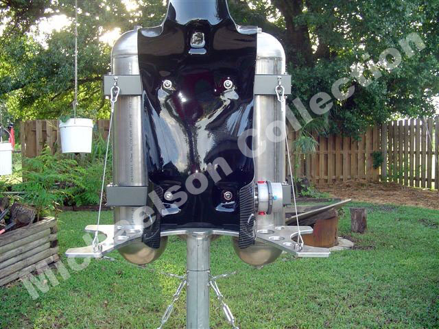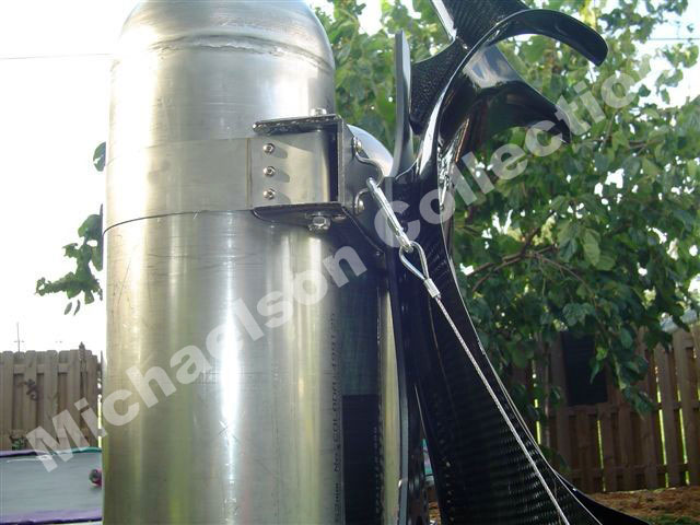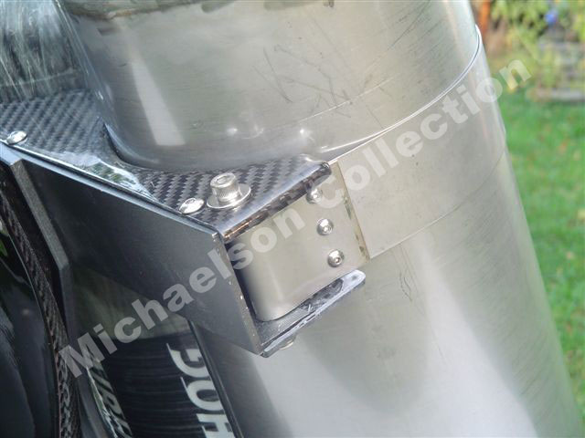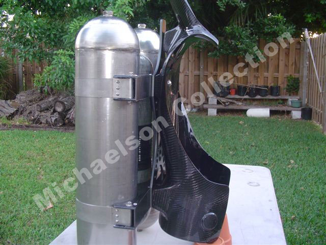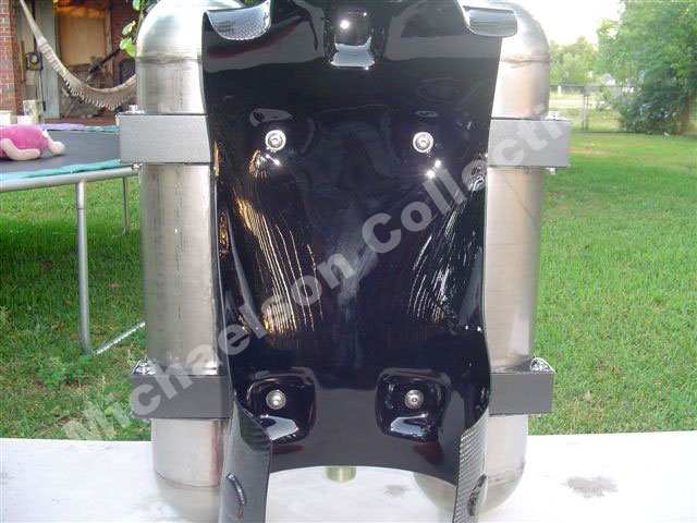 Here are latest pictures Bill has sent me. The Corset looks incredible after PPG clear. Bill did all of this with a router, drill press, and belt sander. The Corset parts are made out of aluminum. Then Bill sandblasted them for a texture, then he painted them with a PPG automotive gray. The tank holders have carbon fiber cover on them.